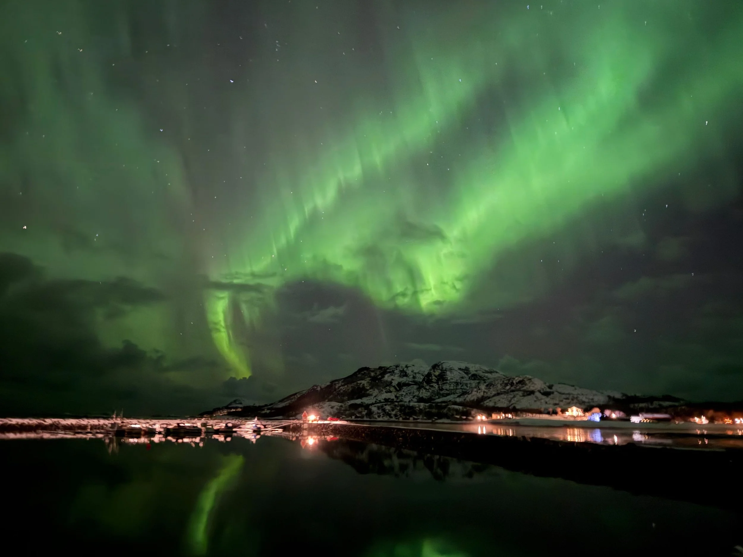 Da jeg gikk mot Viksjøen for å gå ombord igjen flammet nordlyset over Helgelands stjerneklare senvinterhimmel. Ombord var det varme og lys og verden var som den gjerne må. Jeg tørket båtråmen ut av køyelakenet over varmlufta fra apparatet, og tok to enheter til fra pappen mens jeg ventet. Før jeg stengte varmeapparatet for natta.