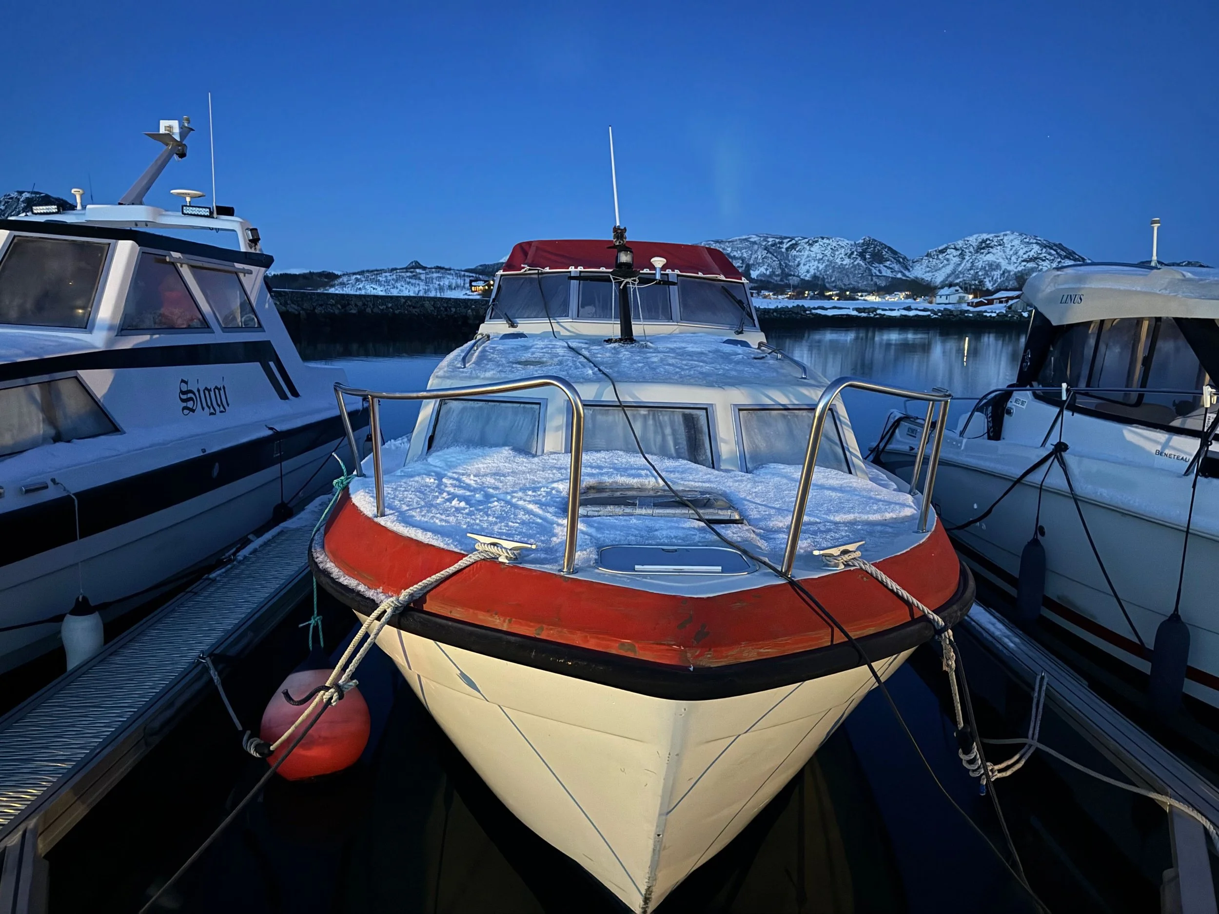 Skuta lå på plassen sin tilsynelatende som forutsett da jeg forlot den sist sommer. Den var lett nedsnødd, og det lå skaresnø på ripa som måtte klaters for å komme ombord. Jeg jiglet meg utover utstikkeren mens jeg holdt meg fast i nabobåten, som lå tettere inntil enn meg. Jeg dunket og plukket vekk skaren på ripa og trakk opp glidelås og kneppet opp knapper. Jeg grep handrailen og satte høyre tåballe og stortå mot fenderlista og heiste meg opp. Stående på ripa inspiserte jeg kalesjetaket, der det har seg med å samle seg en dam jeg noen ganger har fått i nakken. Den var nå frosset til bunntæla is, men var ikke større enn at den kunne bankes løs med et slag innenfra fra undersida. Jeg hev isklumpen på havet og trakk glidelåsen videre av. Jeg pirket mer snø og is laus fra kalesjetaket og fikk tak i tøystroppen oppå der til å holde seg fast i når en skal stige inn. Så steg jeg ned på benken bak rorplassen på styrbord side. Og videre ned på dekk. Hm. Det gikk altså bra. I år også. Det er nå så rart med det. Snedig. Hm.
